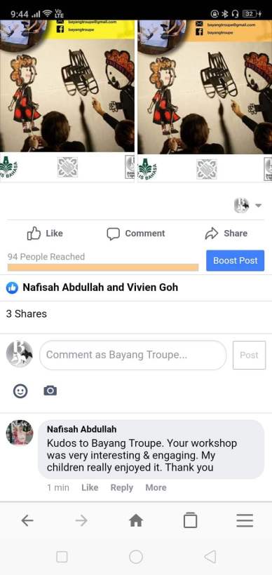 Bayang Troupe focuses on Contemporary Shadow Puppetry and we enjoy imparting the skills and knowledge of making simple shadow puppet performance to our youths.