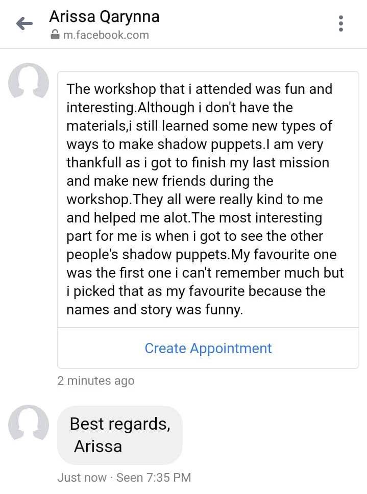 We do not focus on traditional shadow puppetry (Wayang Kulit) as through our journey overseas, we have discovered that shadow puppetry goes beyond that. We would like our youths to have that opportunity to express their creativity in creating their own contemporary shadow puppets and stories that can teach and help them understand many social issues that they can and will encounter throughout their journey in life.